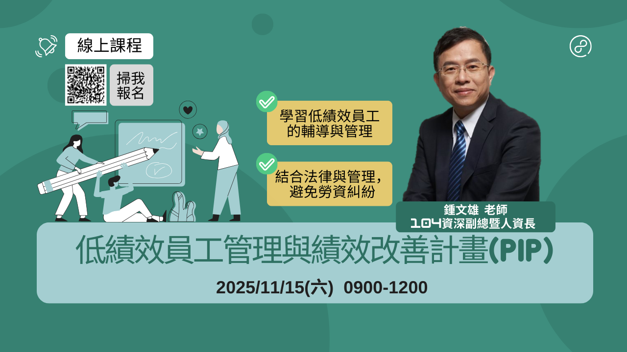 透過講師實務經驗分享,以及個案分析研討,引導學員認知對於低績效員工的輔導與管理的重要性,結合勞動法令與企業管理概念,使學員能夠體認合法、合情、合理管理模式的精髓與價值。