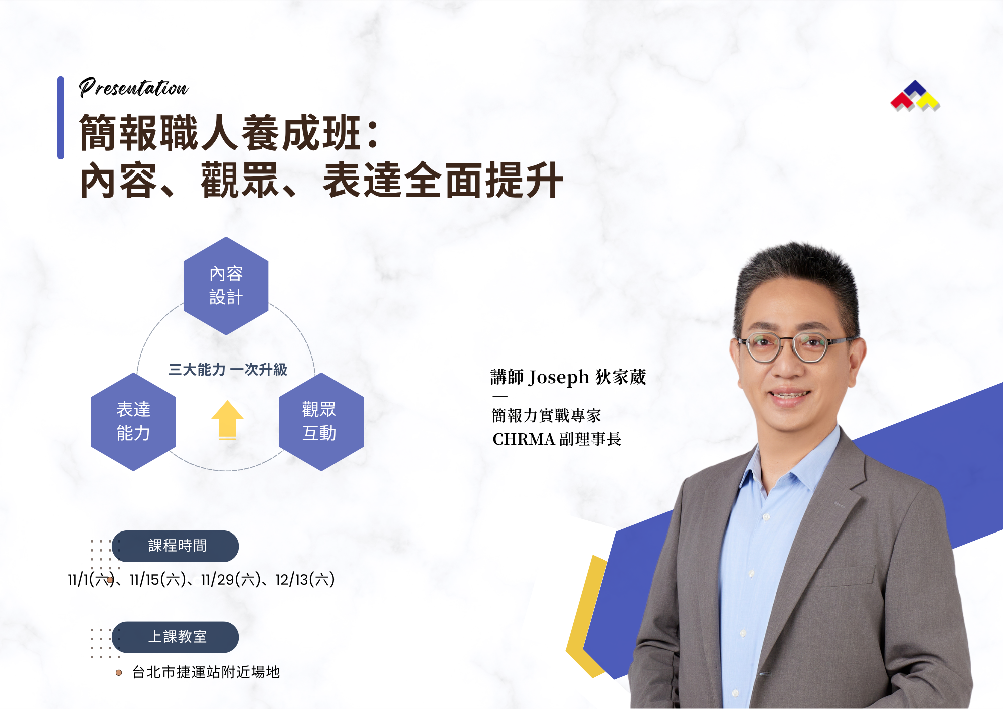 Joseph 老師擁有超過 20 年企業訓練與實戰經驗,是一位結合「簡報藝術」、「影響力表達」、「管理領導」與「教練式對話」等多元專長的專業講師與顧問。他不只是教「怎麼說」,更擅長教「怎麼讓人願意聽、聽得懂、願意行動」。