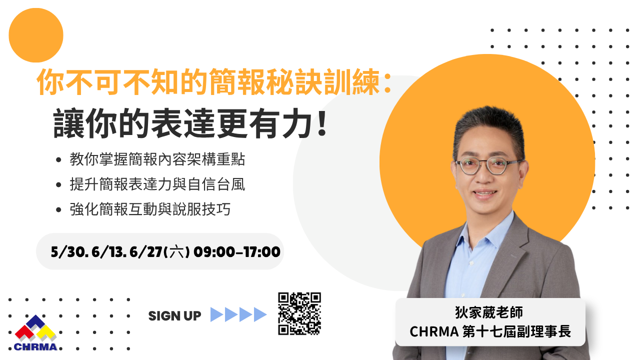 **本課程共 3 天,每天皆安排 演練時間。演練將由 講師+兩位助教 分組/輪流帶練與指導,確保每位學員在實作時都能獲得即時協助。** 1.報名前請先詳讀新手報名指南、學員須知、退費辦法確認沒問題後再進行報名。 (1)新手報名指南:https://chrma.pse.is/5kg6dr (2)學員須知:https://chrma.pse.is/5kg6fv (3)退費辦法:https://chrma.pse.is/5kg6hh 2.課程最晚開課前一週確定是否開課,課程確定開課後,將再於本網頁公布早鳥優惠繳費日期。 3.已繳費之學員若課程當日無法出席,且未於開課前一工作日17:00前通知課程承辦人員辦理退費,視同本班之學員,將於課後郵寄講義。 4.為維護學習有效性與上課同學的權益,課程僅限本人參加。 5.本課程附講義、午餐。 6.會費:開立收據,將於7個工作天掛號寄出。 7.課程費用:開立電子發票。報名課程填寫資料時,務必清楚填寫需開立三聯式(公司)/二個式(個人)發票類型,於收到費用後7個工作天內依填寫資訊開立完成,將寄至您會員資料留存的信箱,請務必更新會員資料。如開立發票後需改開發票,將收取手續費200元。 8.使用學習優惠券之有效日期需涵蓋第一天開課日,超過使用期限即無法使用,恕不展延。優惠券使用辦法:https://chrma.pse.is/5kg6mb 9.本協會保有變動權。