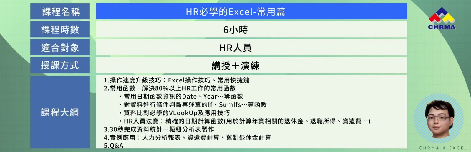 為此規劃「HR必學的EXCEL-常用篇」應用課程,本課程目標如下: