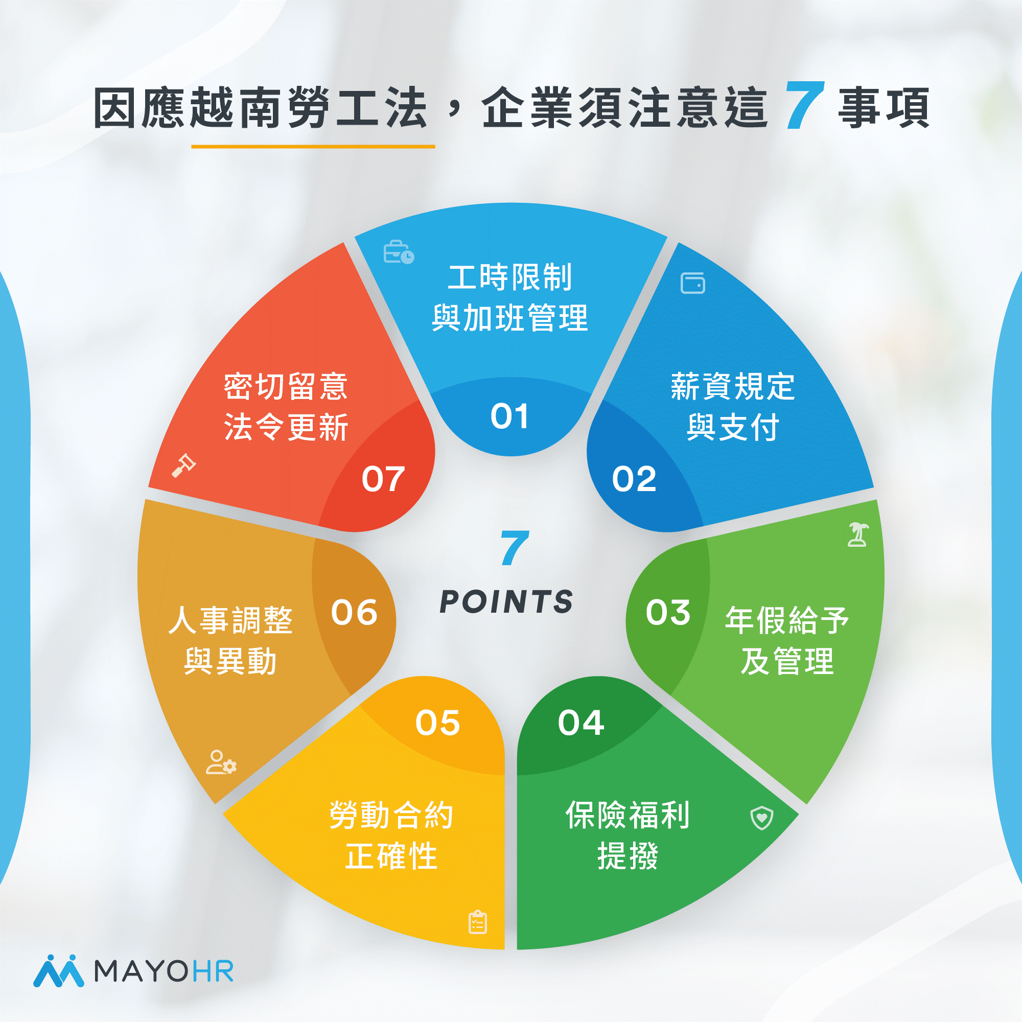 對於跨國企業來說,越南勞工法令是進入當地市場的首要挑戰,因為法令的影響會牽涉到企業人力管理層面,公司必須慎防法律風險。 因應越南勞工法,企業須注意這7事項: