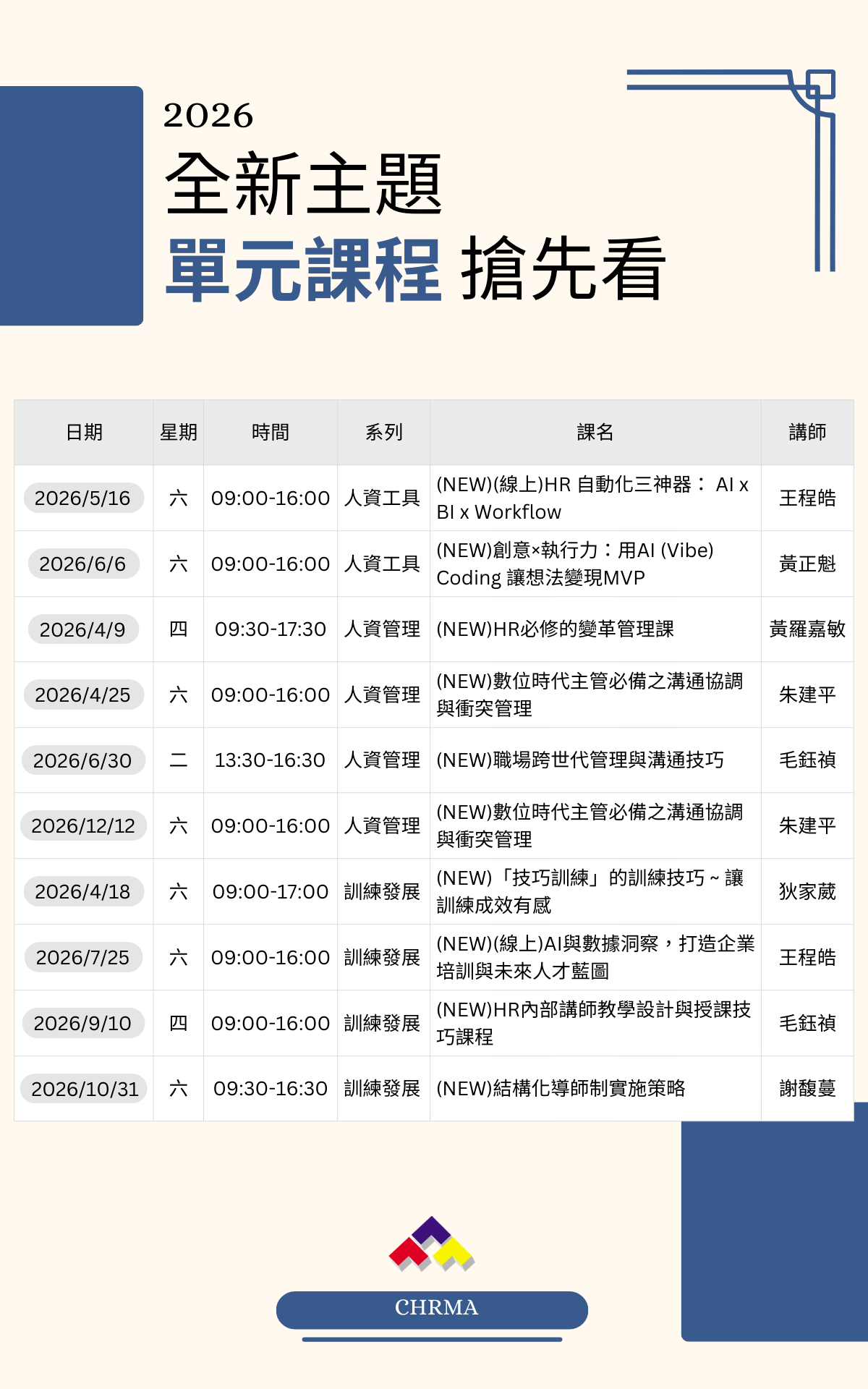 歡迎各位學員至訓練課程頁面精挑細選,同時CHRMA在2026年也推出了全新的課程!!