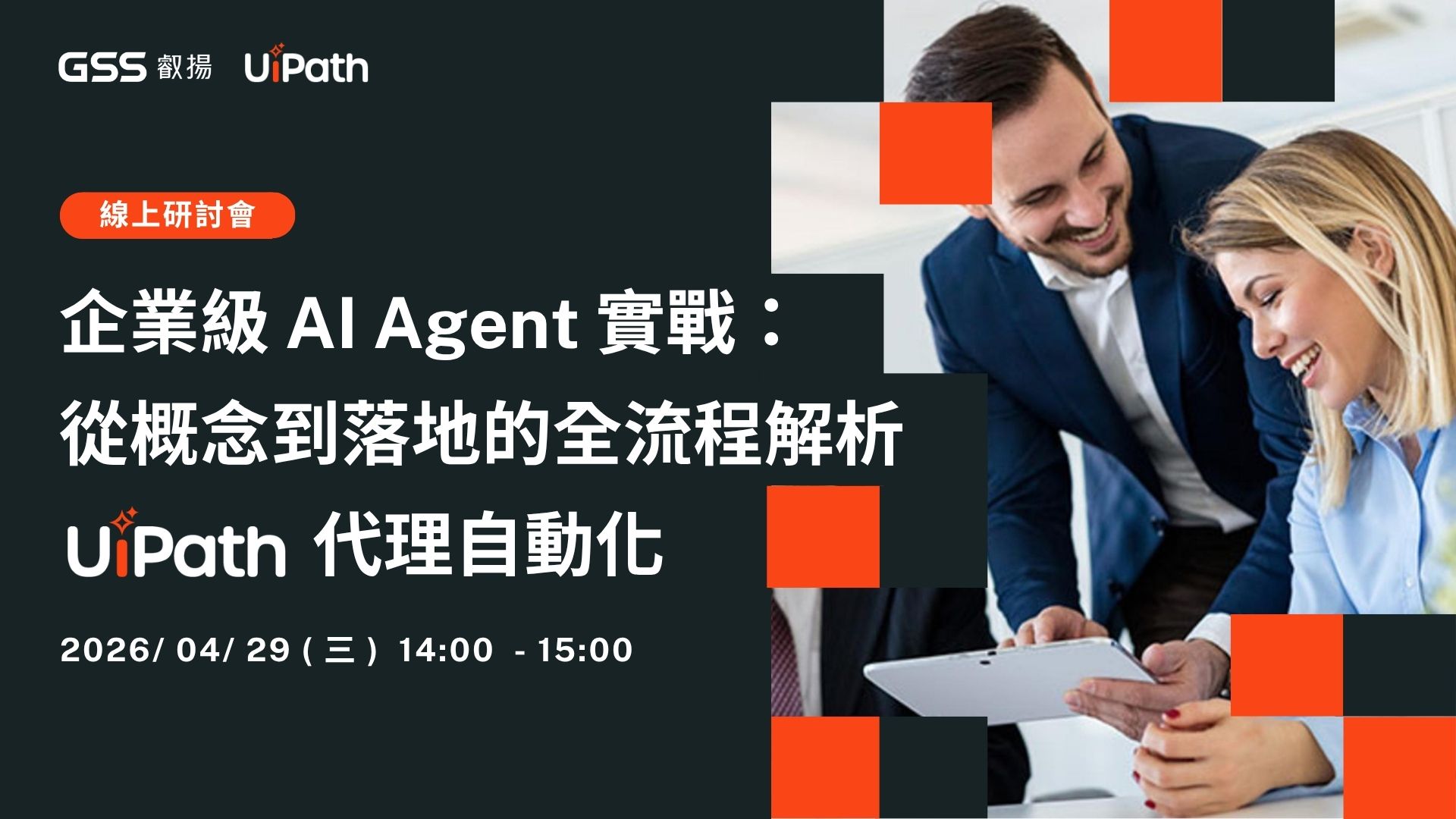 本研討會將從市場趨勢與企業需求出發,深入解析 UiPath 如何將 Agent 能力與既有自動化架構結合,能更清楚掌握代理自動化的核心價值、最適合導入的流程場景,以及企業在落地導入時必須關注的關鍵要點。