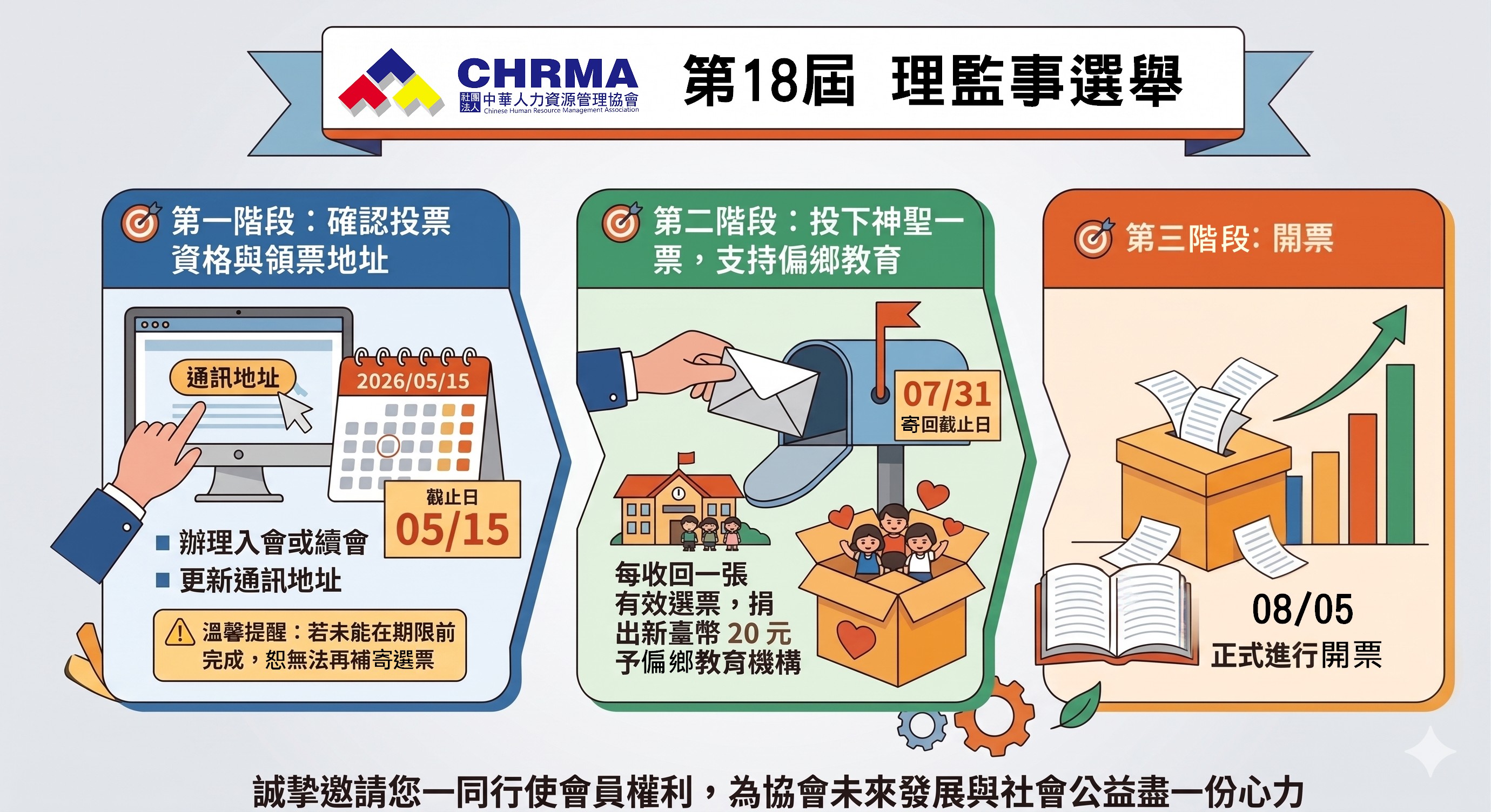 感謝您長期對中華人力資源管理協會的支持與參與。本會即將辦理兩年一度之理監事改選,您的每一票,都是推動 HR 專業發展的重要力量。