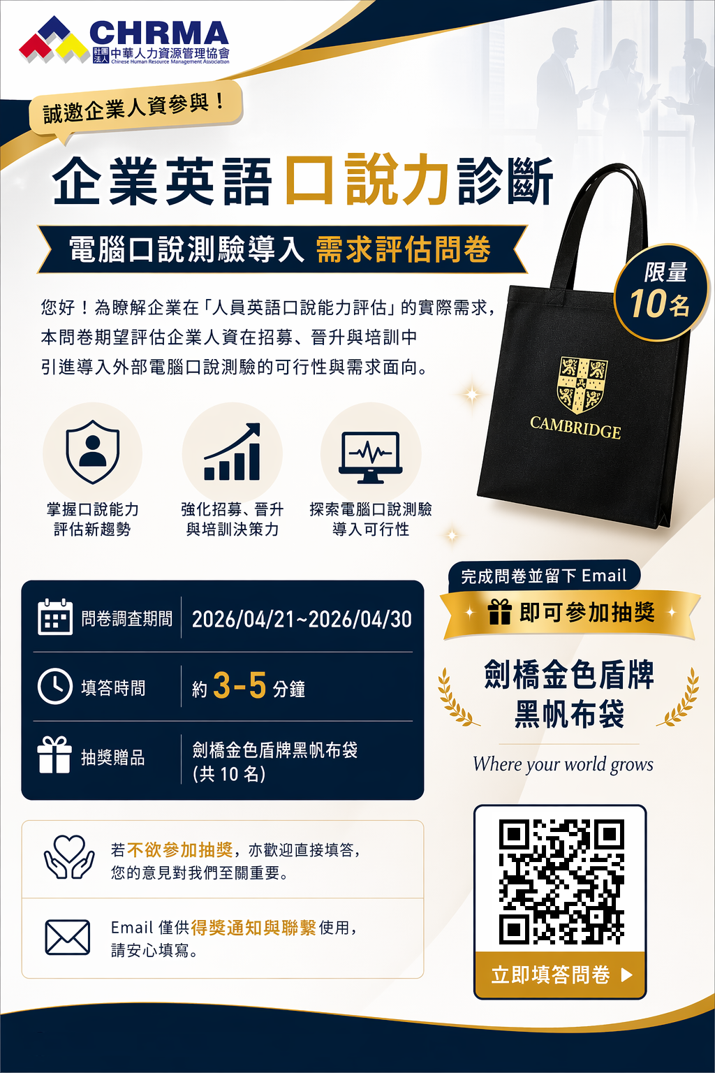 為瞭解企業在「人員英語口說能力評估」的實際需求,本問卷期望評估企業人資在招募、晉升與培訓中引進導入外部電腦口說測驗的可行性與需求面向。